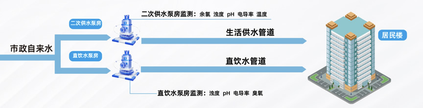 自來水自水廠生產輸送到用戶終端,需要通過較長的管網進行輸送。由于自來水管網老化后生銹、結垢、破裂泄漏;小區、高樓等建筑蓄水設施密封條件差,甚至無密封措施,致使水體出現嚴重的變質和污染的現象時有發生。通過水質在線監測技術對最后一公里水的水質進行監測及響應處理,是保障人民生活質量的基本要素。